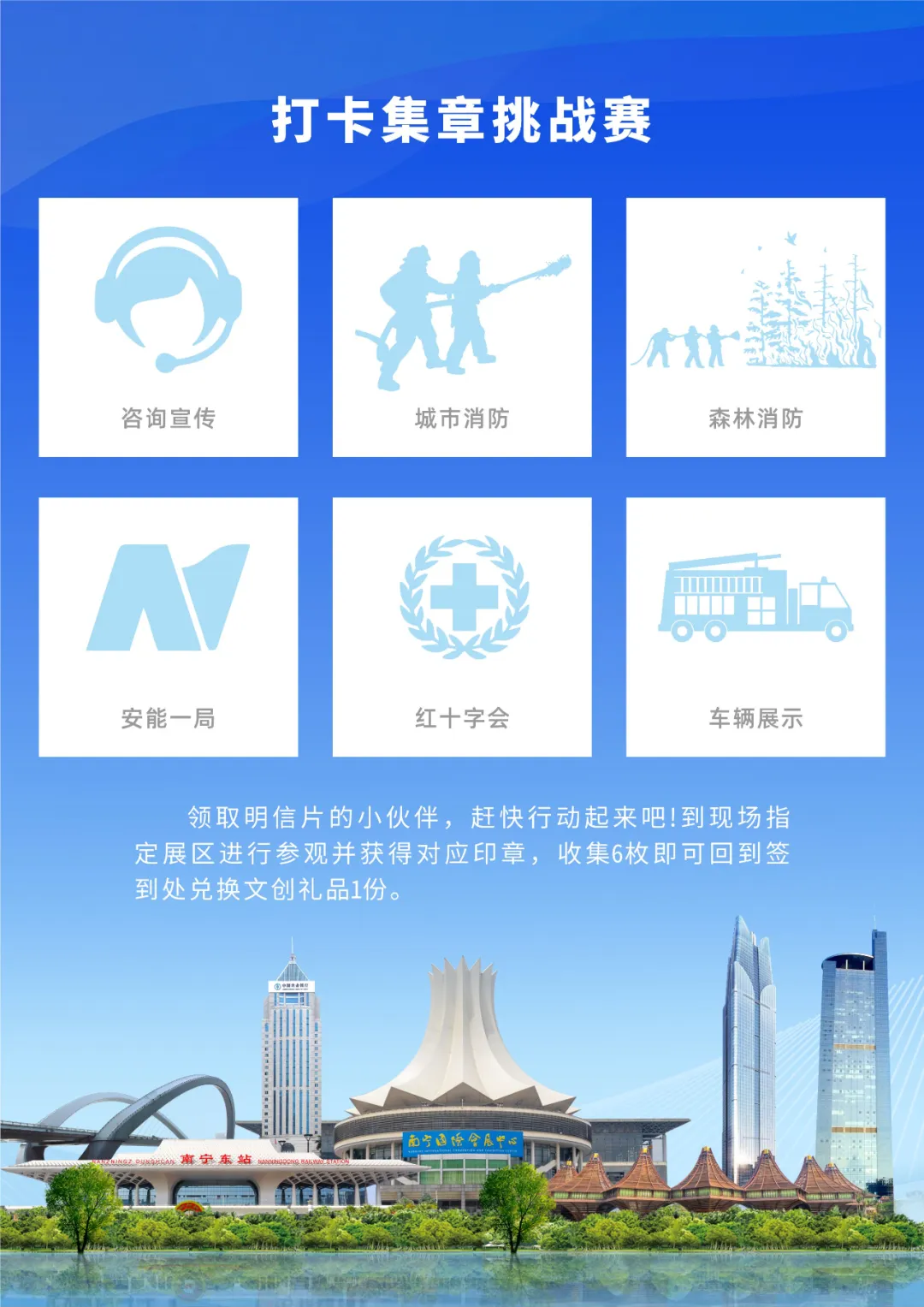 收集6枚印章回到签到处,即可兑换防灾减灾精美文创礼品一份!(礼品数量有限,兑完即止 )时间:2024年5月12日(周日)09:00-11:30广西“全国防灾减灾日”主题宣传活动面向所有市民朋友们,活动当天来参加即可。未成年人请在家长陪同下参加。1. 请前来参加活动的市民朋友们遵守现场活动秩序,文明参观。