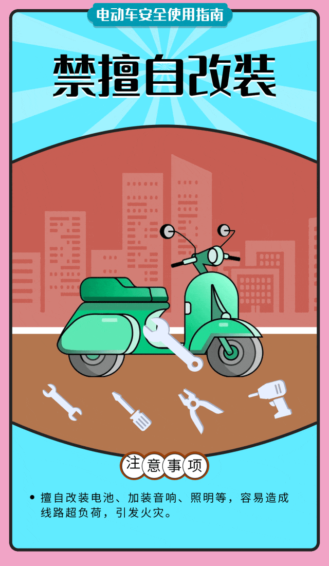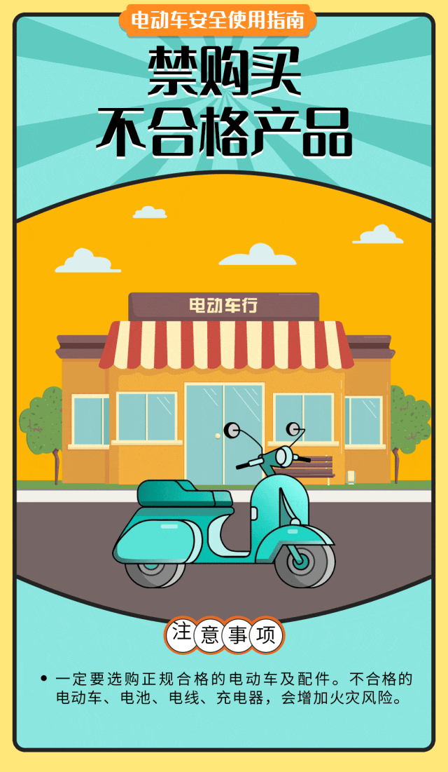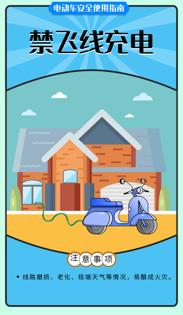 为了您和他人的生命安全,请勿心存侥幸!拒绝电动自行车进楼入户,不要违规私接充电线路,不要盲目改装电动自行车,加强日常自查自检,不要在网上购买没有品牌、没有质量保障的电动自行车,以下知识,请大家一定要牢记!